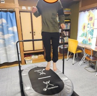 ともにではサイズは小さいですが、安全性のある手すりが付いており「足の裏をしっかり付けて跳ぶこと」「手すりを掴んで跳ぶこと」「順番を守ること」などお約束ごとを掲げて、活動として取り入れています。体幹を鍛えることで、バランス感覚が養われます。また、気持ちが安定しない時に、跳ぶことにより気持ちが和らぎ、笑顔が出てくることが多く見られています。